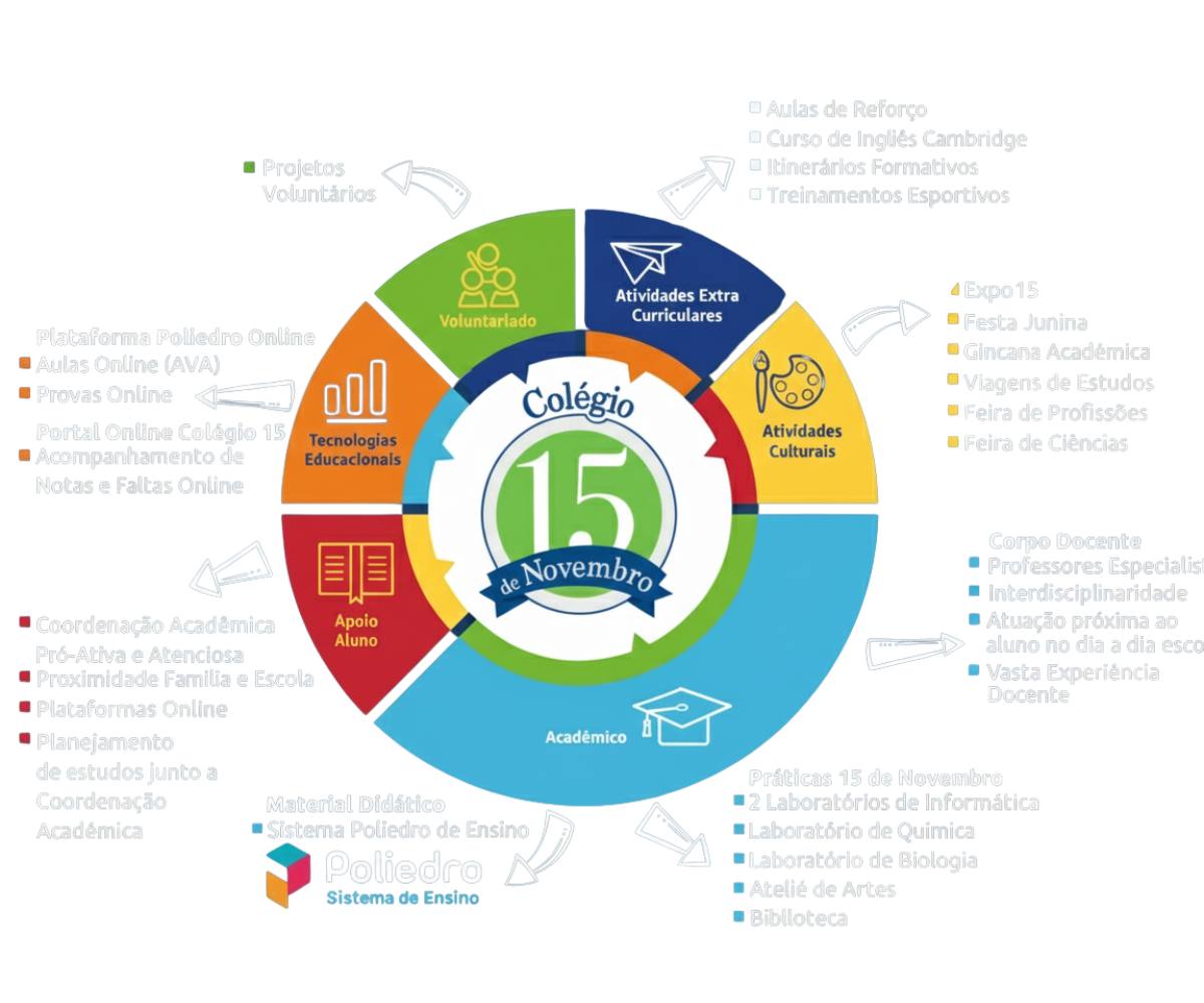 O Colégio 15 de Novembro é parceiro do Sistema Poliedro, referência nacional em qualidade educacional e inovação pedagógica. Essa parceria fortalece nosso compromisso com uma formação completa — que alia excelência acadêmica e propósito humano, preparando nossos alunos para os desafios do presente e as conquistas do futuro.